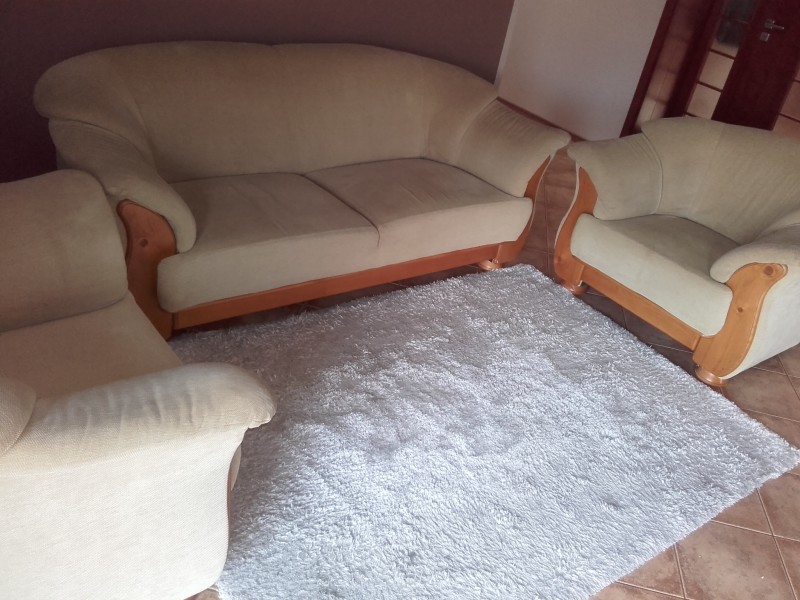 Nabízíme sedací soupravu 3+1+1. Potah je režná látka v kombinaci s masivním dřevem. Barva: písková Nerozkládací. Velmi pohodlné sezení. Pohovka nelze dát do prostoru. Rozměry:délka pohovky:200cm,hloubka:90cm, hloubka sedu: 55cm,šířka sedu: 140cm. Výška:80cm, výška sedu: 45cm. Křeslo: hloubka 90cm,šířka: 110cm,délka sedu: 55cm, šířka sedu: 45cm. Potah není poškozený, malinké stopy od tužky odmalé dcery-není moc vidět, pro pořádek uvádím. Hnědý potah a 3 polštářky můžu u zájmu přidat zdarma ... PC-vysoká, díky kvalitě potahu a masivnímu dřevu.Kuchyň a kuchyňská linka
