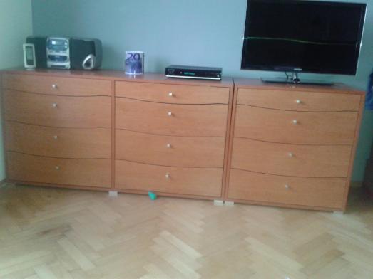 Prodávám 2 komody - š. 153cm x v. 80cm x h. 48cm a š. 77,5cm x v. 80cm x h. 48cm. K tomu 2 noční stolky - š. 42,5cm x v. 59cm x h. 48cm. 2.000 Kč.Nábytek
