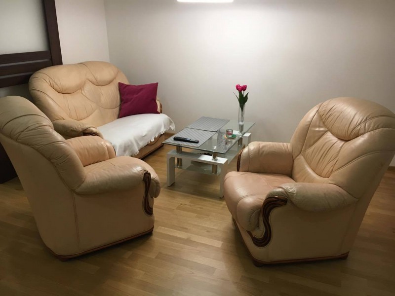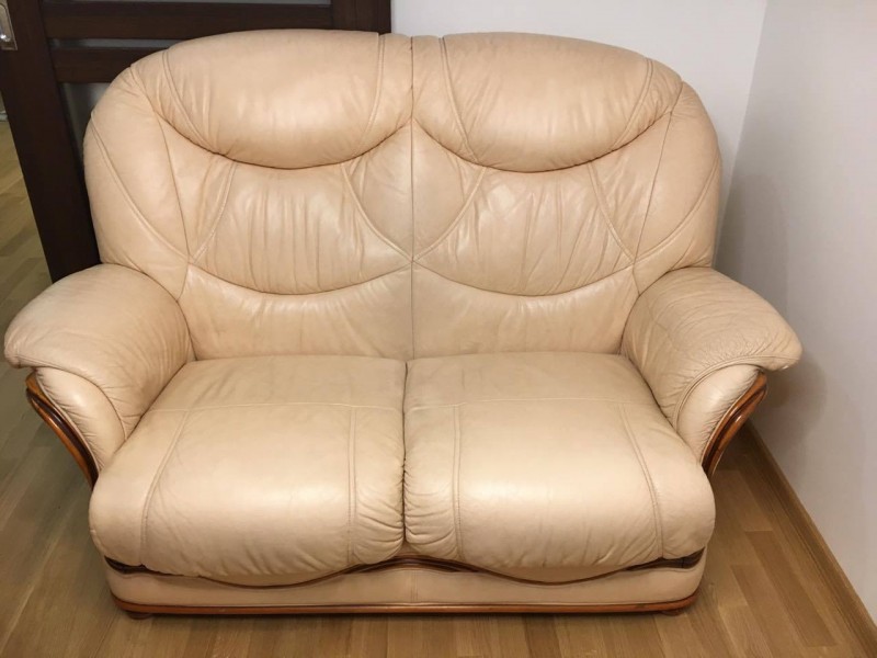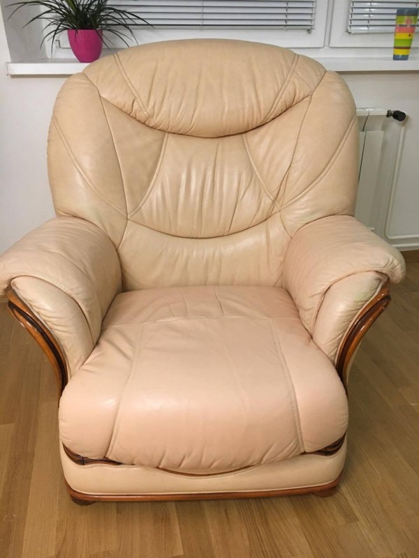 Prodám koženou sedací soupravu v krémové barvě s kombinací dřeva. Velmi dobrý stav! Rozměry sedačky: 150 x 70 cm, rozměry křesla 95 x 70 cm (šířka x hloubka).Nábytek