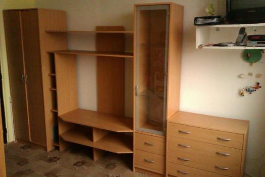 Prodám stěnu - barva ořech, stěna se skládá ze skříně na šaty (jedna police a prostor pro zavěšení), prosklená skříň se dvěma dřevěnými šuplíky ve spodní části, prostorem mezi skříněmi viz foto a komodou s dřevěnými šuplaty. Délka stěny 3 metry. Místo odběru Přerov. Stěna je v perfektním stavu. Cena 2.900 Kč.Něco o nábytku...