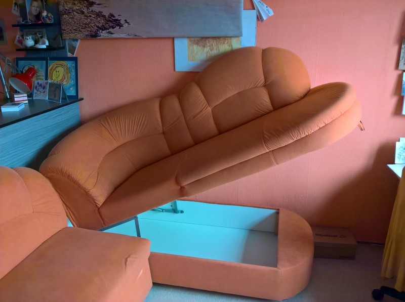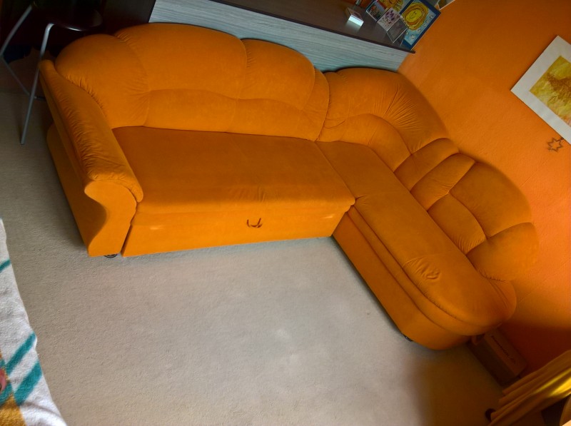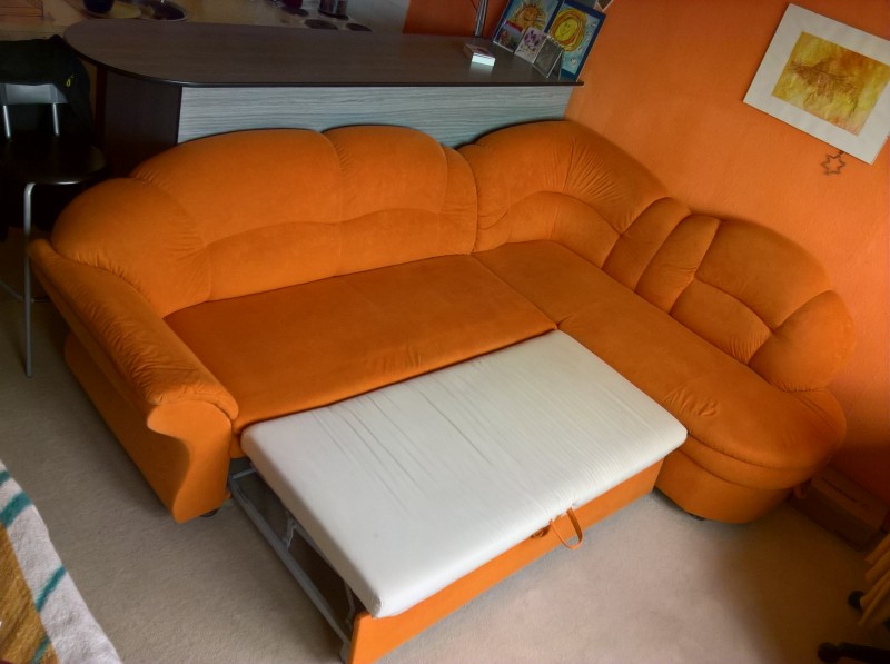 Rohová sedačka lososové barvy, potah látkový, sedačku lze rozložit jednoduchou manipulací, v jedné části je úložný prostor.Matrace a rošty