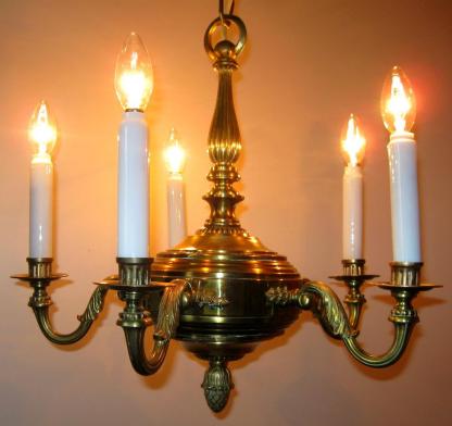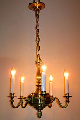 Prodám mosazný lustr, pětiramenný (z období historismu - kol. r. 1916), krásný, plně funkční. S náhradními skly. 8.500 Kč.