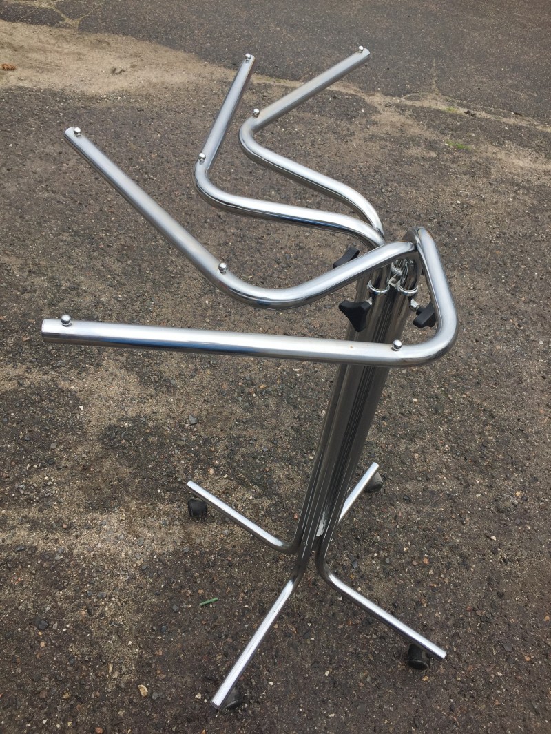 Prodám kovový pochromovaný nastavitelný stojan do prodejny. Výškově stavitelný, s kolečky, s otočnými rameny. Koupený za 2500,-Materiály nábytku