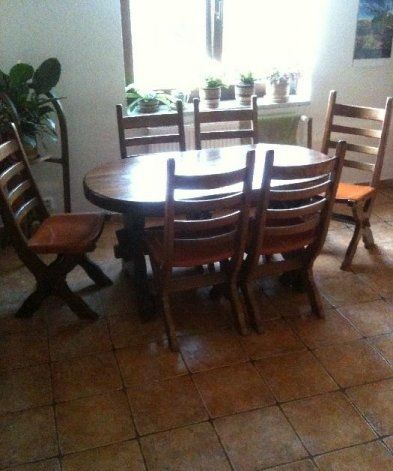 Prodám dubovou jídelní soupravu z masivu,stůl a 6 židlí s koženými sedáky...rozměry stolu délka 150 cm,šířka 80cm,výška desky 7,8 cm!..velmi pěký udržovaný stav...pouze komplet...Něco o nábytku...
