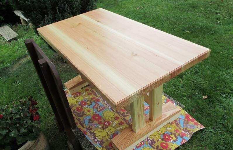 Prodám stolek o rozměrech 122-66-64cm je vyroben z masivu Deska o síle 5 cm ze severského modřínu. Nalakovaný bezbarvým lakem, vhodný do pokoje i jinam. Zakázková práce. Váha 50kg, můžou se přidat i kolečka pro lepší manipulaci. Dále polička na zeď, rozměry 80-60-20cm, materál modřín, bezbarvý lak, cena 1000Kč.Nábytek