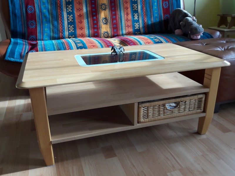 povrchová úprava lamino světlý buk, rozměry šxhxv 110x70x50 cm, police s košem, uprostřed skloMateriály nábytku