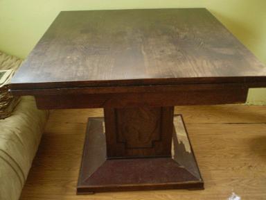 Prodám velmi starý rozkládací stůl vhodný na chalupu.Po rozložení si k němu sedne osm až deset lidí.Poškozená dýha. Vlastní odvoz. 1.000 Kč.