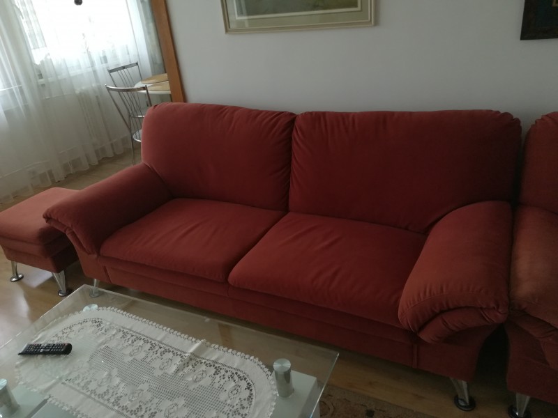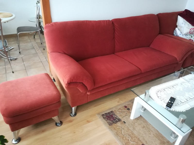 Velmi zachovalá sedačka, pohodlná, masivní, povrch příjemný plyš. Taburet-podnožník rovněž jako nový. Křeslo mírně opotřebované. Stáří 10 let.Něco o nábytku...