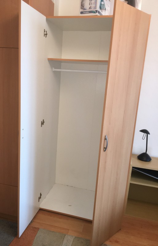 Jedna police, tyč na pověšení ramínek, dekor buk. Nepoškozená, jako nová.Materiály nábytku