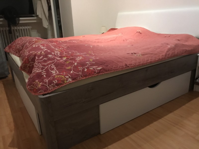 Predám nepoškodenú takmer novú manželskú posteľ (používaná 2 mesiace) s drevenými roštami, zdravotným matracom a nočnými stolíkmi. Ako bonus nočné lampy na stolíkoch. Posteľ má veľký úložný priestor vo forme 3 výsuvných šuflíkov. Predaj z dovodu sťahovania do zariadeného bytu. Povodná cena aj s matracom 16.000 KČ. Nutný vlastný odvoz.Něco o nábytku...
