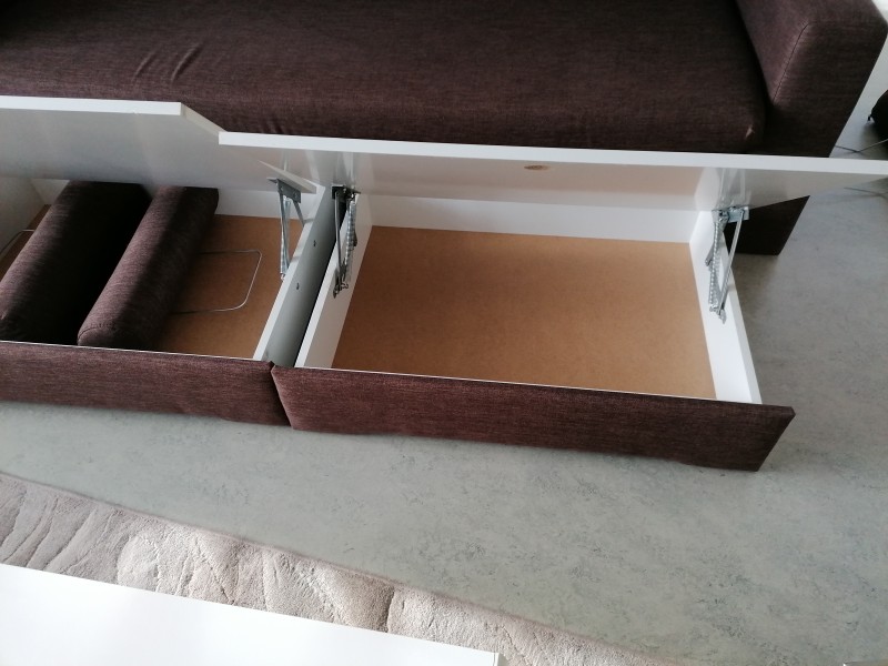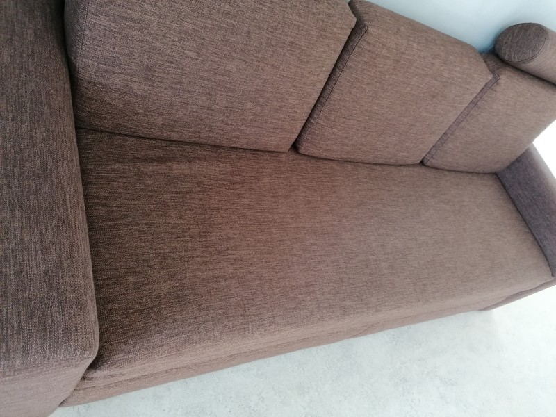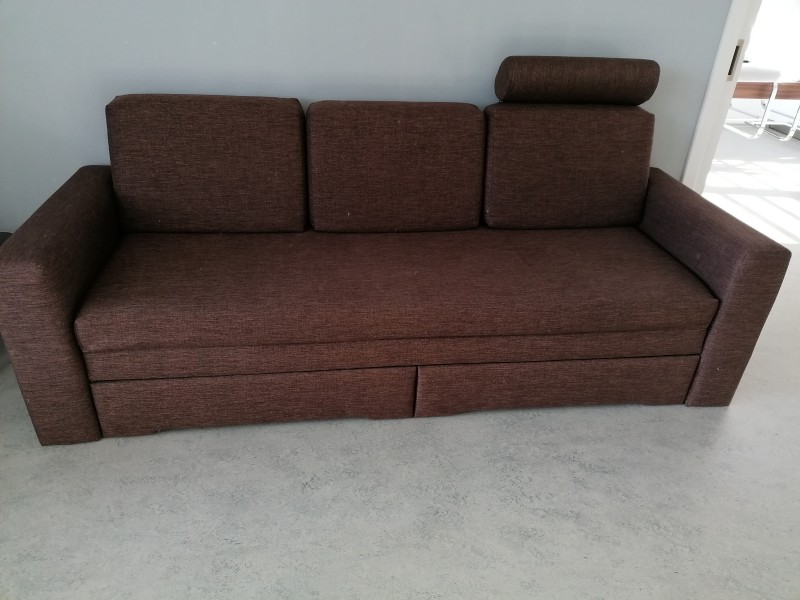 Rozkládací gauč, česká výroba na míru. Polštáře na uzávěr, možnost praní. 3x opěrka hlavy. Rozměry - délka 235 cm, hloubka 85 cm (hloubka sedu 55 cm), celková výška 93 cm (bez opěrky hlavy), výška sedáku 45 cm, výška opěrky zad 48 cm, výška opěrky rukou - bočnice 64 cm. Ložná plocha na spaní 160 x 200 cm. Záda potažena látkou ve stejné barvě. Po rozložení na ložné ploše jsou stopy od fixu, nešlo vyprat, nechalo flek. PŘI RYCHLÉM JEDNÁNÍ SLEVA!Matrace