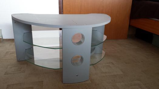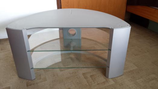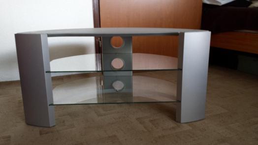 Nabízím televizní stolek. výška 39cm, šířka 79cm, hloubka 47,5cm. Stříbrný se skleněnými policemi v designu původně pro TV Sony. Cena 990 Kč.Materiály nábytku