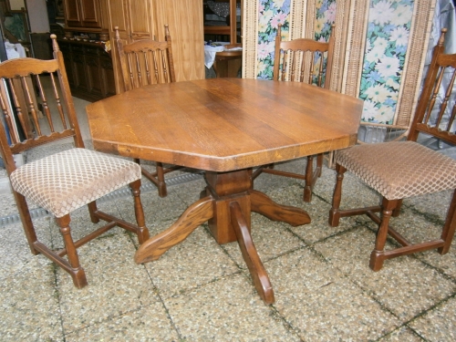 Nabízíme velice pěkný, zachovalý,rustikální, plně dubový šestihranný stůl v setu se 4 stylovými židlemi. Stůl má poctivou desku z plného dubového masivu o síle 5 cm. Deska je široká 120 cm a výška stolu měří od země 76 cm. Stav a provedení nabízeného setu, to vše je zřejmé z připojených snímků.Nábytek