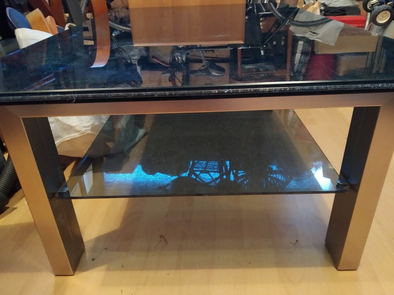 Prodám konferenční stolek se skleněnou horní deskou (imitace popraskaného skla) a skleněnou odkládací plochou ve střední části. Nohy stolu mají kovově stříbrnou barvu. Rozměry: délka 110 cm, šířka 70 cm, výška 42 cm, tloušťka horní skleněné desky 15 mm.