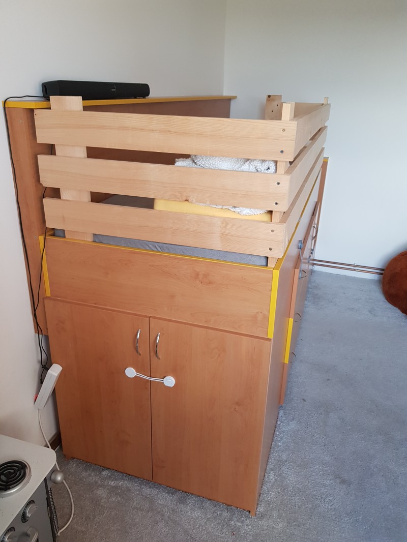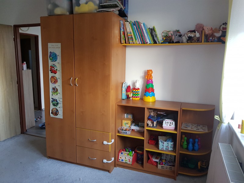 Vyvýšená postel s velkým uložným prostorem -(5x velký šuplík, 1x skříňka se závěsnou tyčí, 1x policová skříňka) •matrace 80×200, polohovací rošt, 2 druhy zábrany( viz foto) Skříň - půlka se závěsnou tyčí, půlka police + 2 šuplíky Poličky 2x- lze zavěsit k sobě Policové regály- variabilní na obě strany Rozměry viz. foto Odběr možný dle domluvy Nutný vlastní odnos+odvozKuchyň a kuchyňská linka