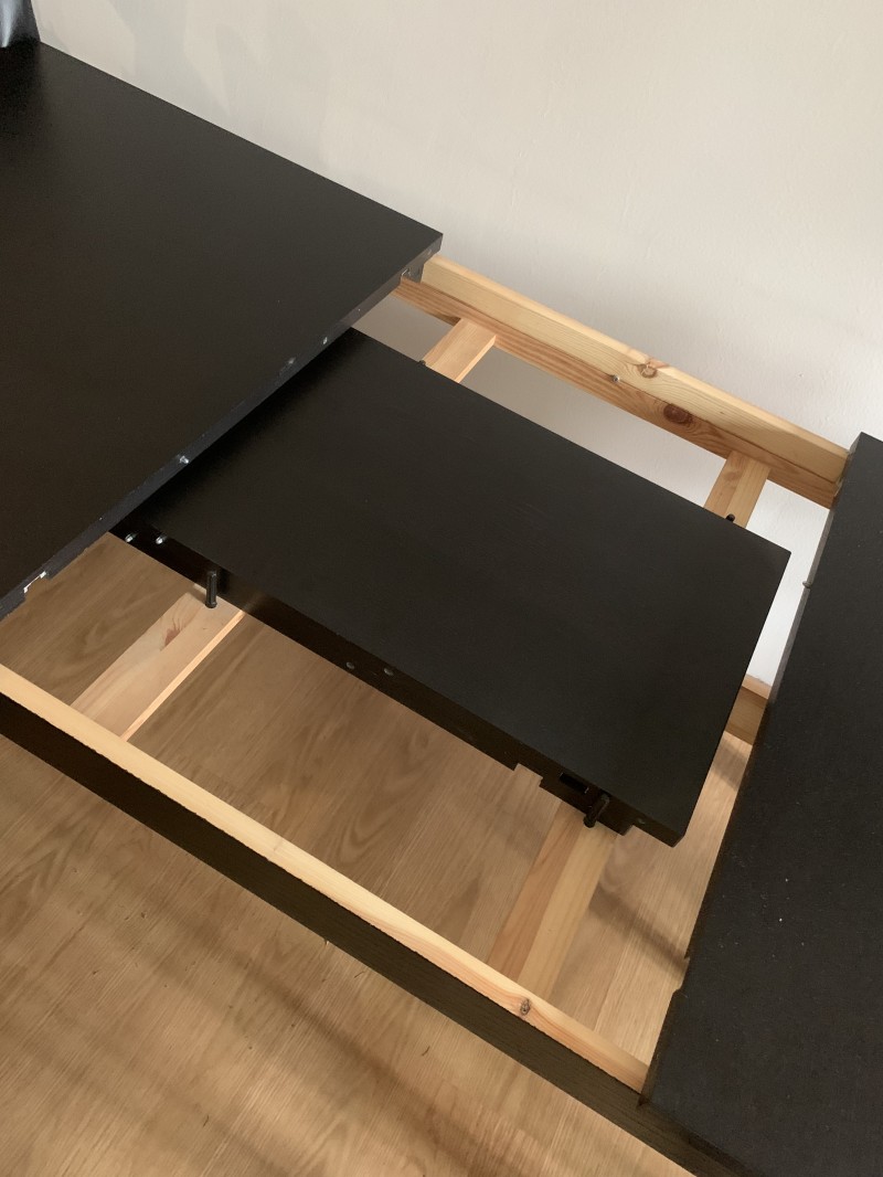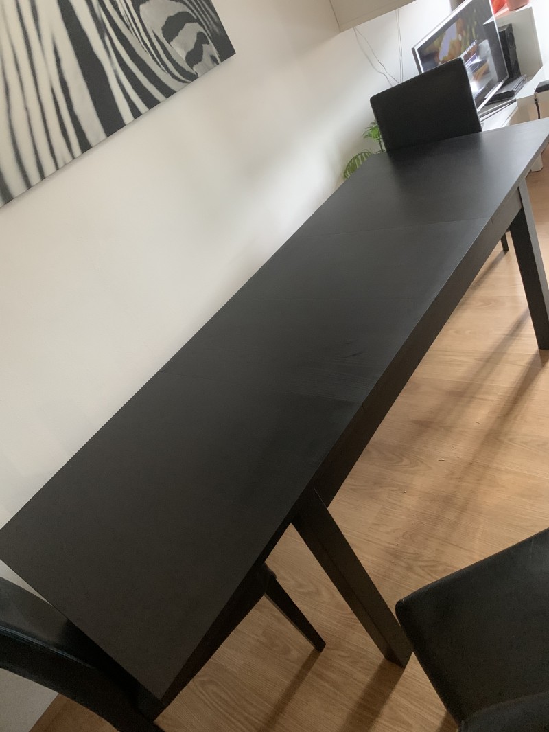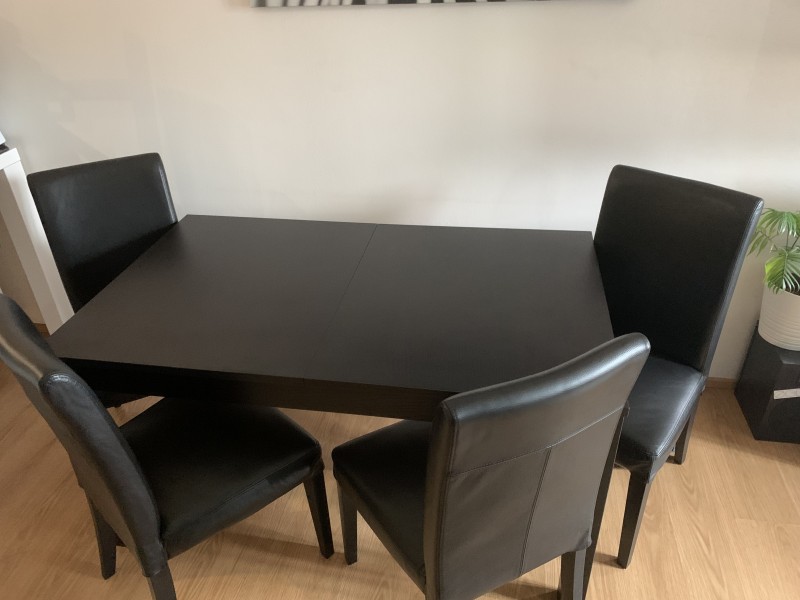 Predám jedálenský stôl spolu so štyrmi jedálenskými stoličkami značky ikea. Stôl má rozmery 140x84cm. Dá sa rozložiť, čím jeho veľkosť môže byť až 220cm na dlžku. Farba je čierno - hnedá dýha. Stoličky sú kožené čiernej farby. Pôvodná cena bola 14000kč. Nábytok má drobne známky opotrebenia. Cena k jednaniu.Nábytek