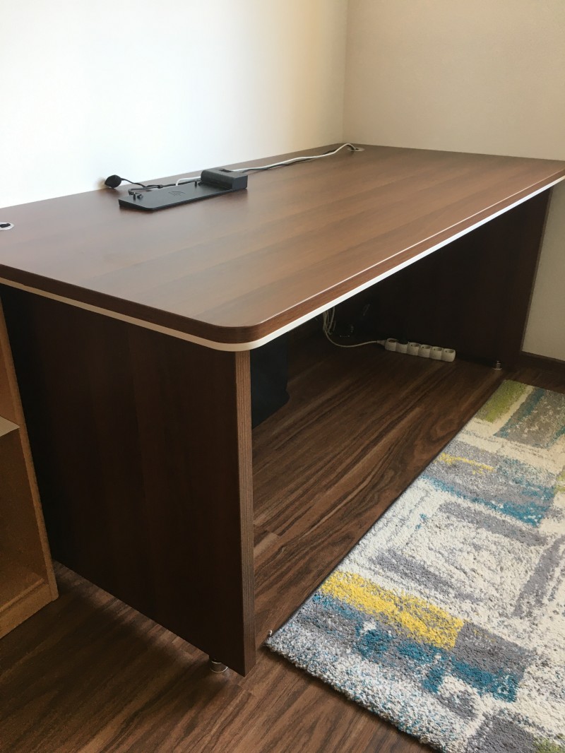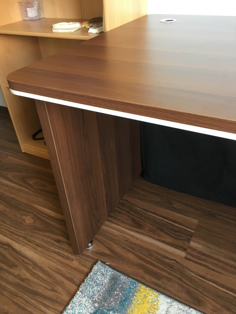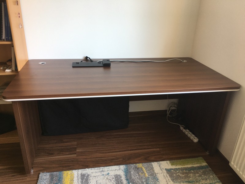 Nabízím kancelářský stůl - je úplně nový, ještě nebyl montován a používán, je v původním balení. Původní cena 7500,-, nyní nabízím za 4500,-. Má z výroby mírné vady - mírné škrtnutí, ale pouze ze stran, které nelze při používání vidět (spodek pracovní desky). Rozměry: šíře- 179,5 cm, hloubka- 89,5 cm, stavitelná výše nohou 76,2- 77,5 cm. Stolové desky jsou vyrobeny z laminované dřevotřísky o tloušťce 36 mm, opatřeny odolnou dvoubarevnou ABS hranou. Dolní krycí panel i podnože jsou z laminované dřevotřísky o tloušťce 25 mm, opatřeny odolnou plastovou ABS hranou. Tmavší dezén ořechu. Předání - buď osobní odběr nebo můžu předat kurýrovi, kterého ale nezajišťuji. Kontakt: 777 083 717.Materiály nábytku