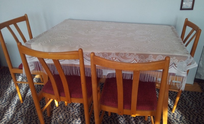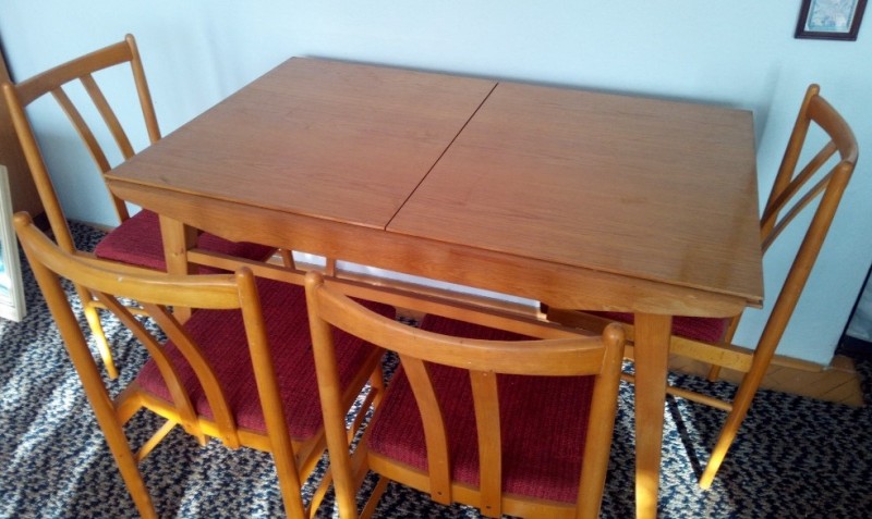 Prodám původní jídelní stůl ze 70. let v bezvadném stavu, včetně židlí. Stůl je rozkládací.Materiály nábytku