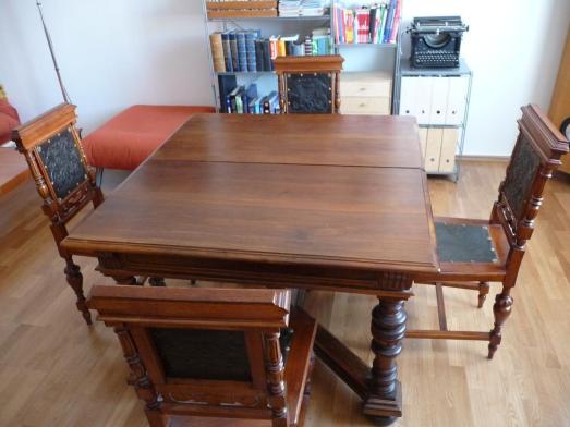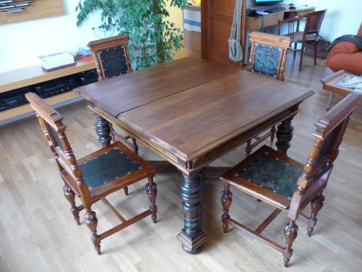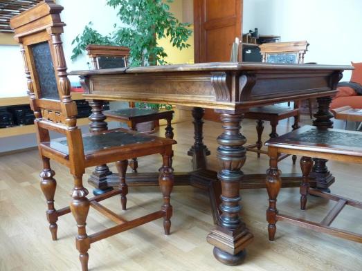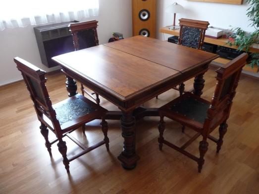 Prodám restaurovaný starožitný stůl, rozměr 120x112cm, výška 78cm, materiál ořech. K tomu 4ks židle, vše kolem r. 1880, viz foto. 28.000 Kč.Inzerce v regionech