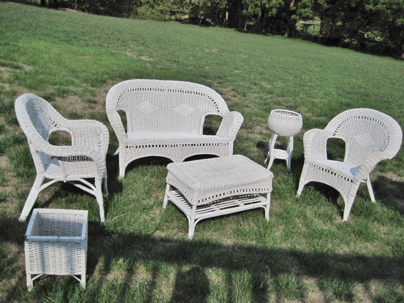 Vše v bílé barvě, celkem dobrý stav, viz. obrázek. Souprava na fotografii je k prodeji kromě taburetu, kterému chybí vrchní díl. Lavice pro dva, dvě křesla, stolek a stojan na květiny.Nábytek