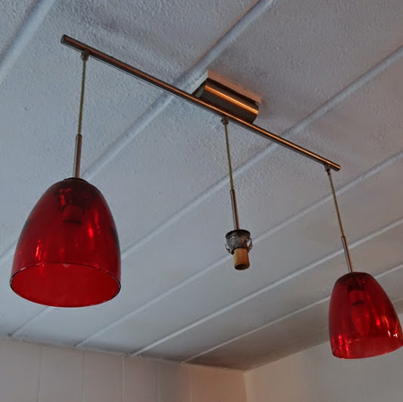 Stínidla jsou ze skla, průměr 74 cm, délka světel i se stínidly 57 cm.Kuchyň a kuchyňská linka