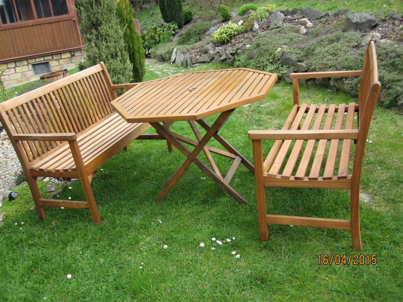 Prodám 2ks lavice z teakového dřeva 2 roky staré,k tomu rozkládací stůl,zánovní potahy a olej na údržbu. Spěchá stěhování.Matrace