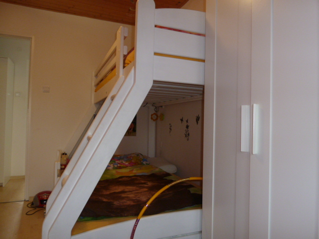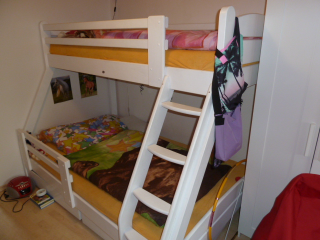 Prodám palandu ze smrkového masivu, se značkovým kováním pro možnost rozložení. Spodní lůžko 120cm, horní lůžko 80cm, délka lůžka 200cm. Šikmé schůdky, boční postranice. Bez poškození, úžasná pro děti a velmi pohodlná a stabilní. Bílá barva. Součástí jsou spodní pojízdá šublata. Původní cena 11000,-Kč. Nyní dohodou.Inzerce v regionech