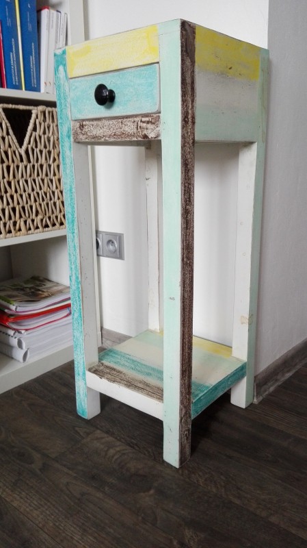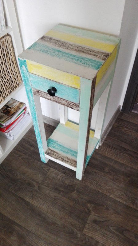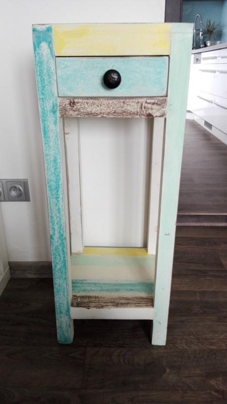 Prodám teakový stolek pastelových barev. Rozměry: v. 80 cm x 30,5 cm x 30, 5 cm. Obsahuje jedno šuple. Vhodný do jednoduchých interiérů.Kuchyň a kuchyňská linka