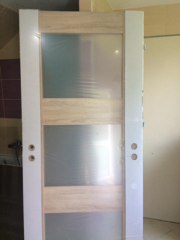 NOVÝ komplet dveře + obložky Interierové dveře s obložkami ve stejné barvě. Nové originál zabalené, prosklené matně, barva světle hnědá s šedivými detaily. Dveře jsou pravé. Bez kování. Rozměry 204x80cm. Dovoz z Polska, bohužel se nám stylově nehodí. Osobní odběr ve Varnsdorfu nutný. Prodáváme pouze komplet dveře a obložky za 2500Kč, pořizovací cena 4tis Kč. Při rychlém jednání možná sleva.